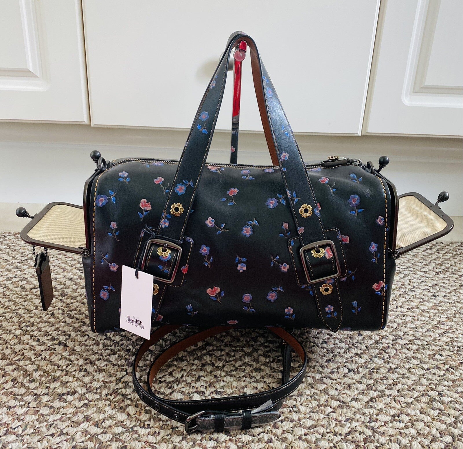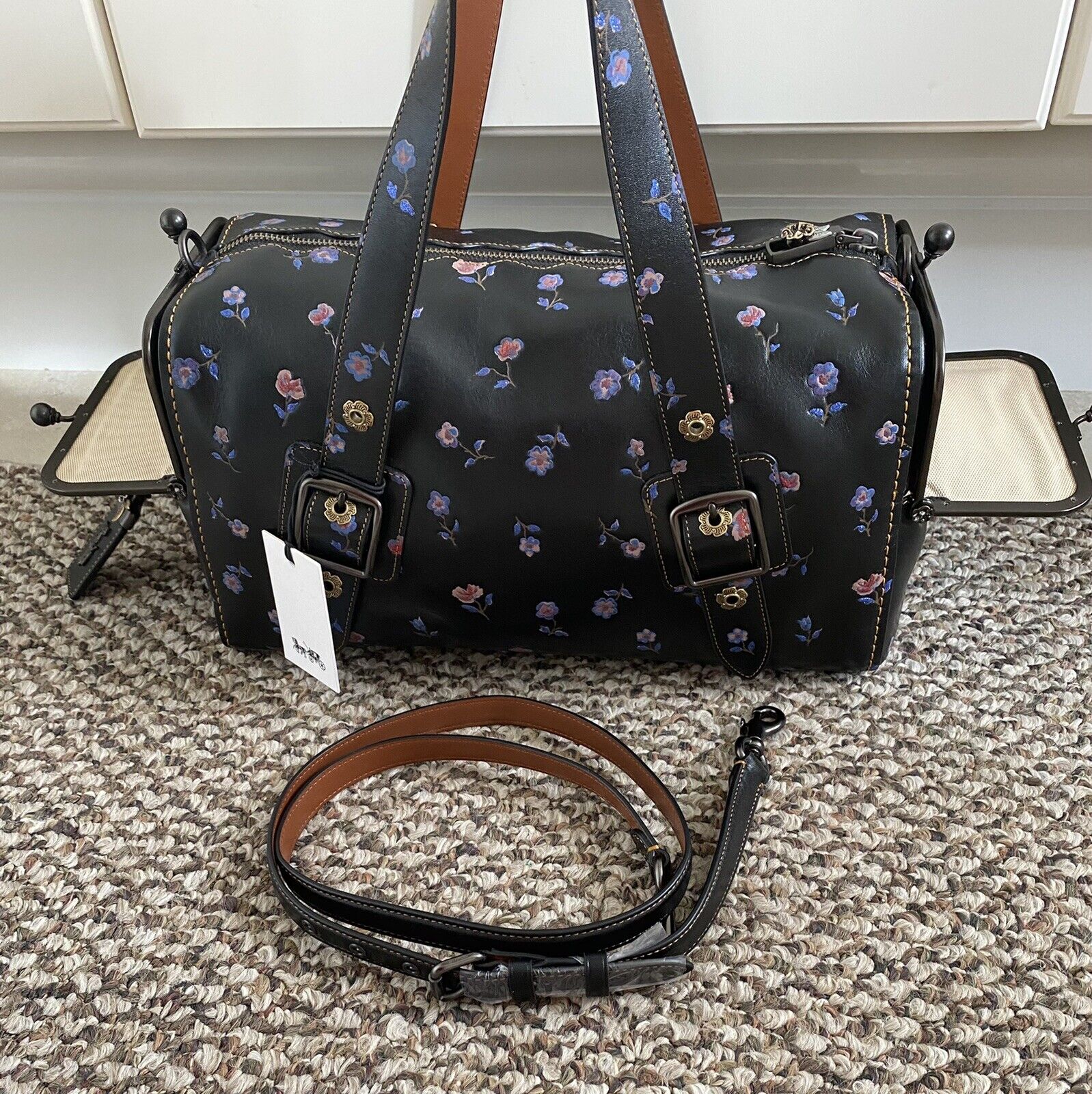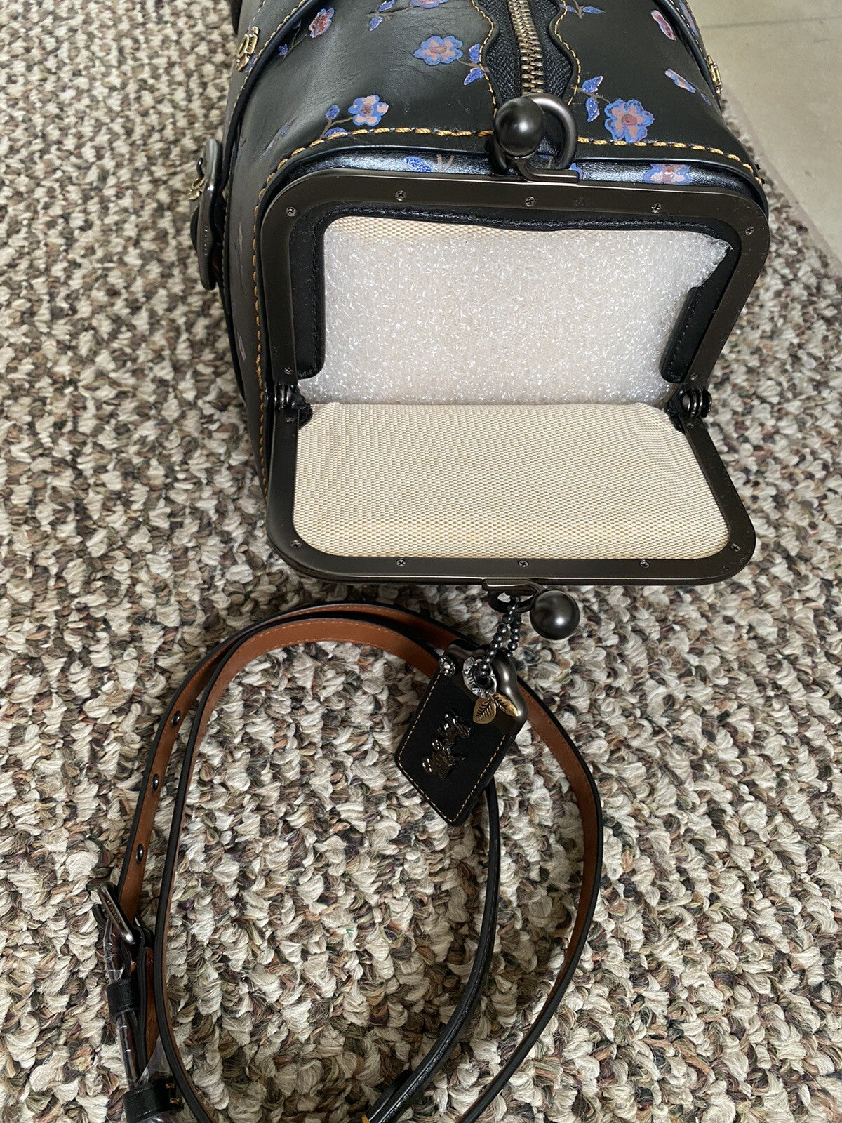 Detachable/adjustable leather strap to 22" drop for crossbody or shoulder wear