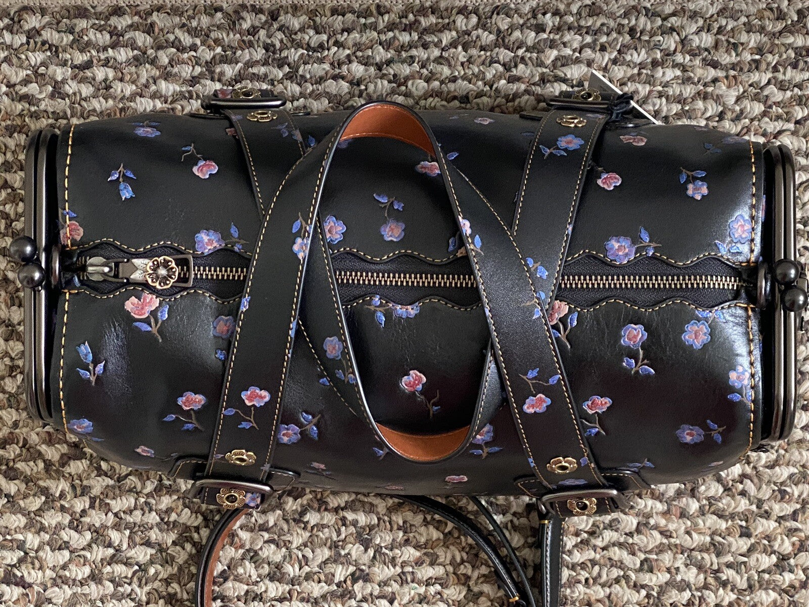 Double slightly adjustable leather handles with metal floral design eyelets 7" drop